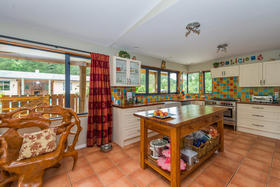 The spacious country kitchen features a double butler's sink, heaps of bench space and bifold windows that open to the bbq area, adjacent to the pool.
