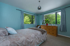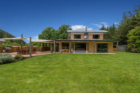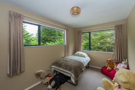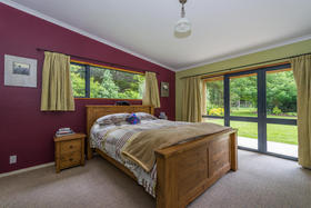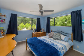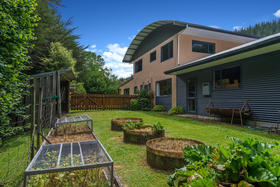 The stunning home includes a master bedroom conveniently located on the ground floor, complete with a generously proportioned ensuite that includes a bath, and french doors that open to the beautifully private garden. This level of the home is double glazed, and also contains the kitchen and living areas, an office, the second lounge area ( rumpus or media room?), a third toilet and a separate laundry. The tiled living areas have underfloor heating from the logburner, and there is also solar water heating.