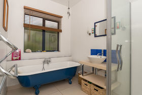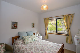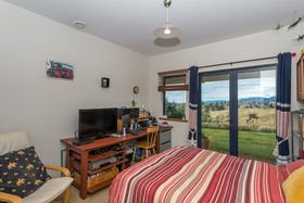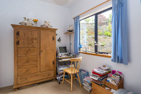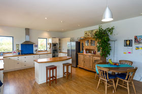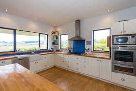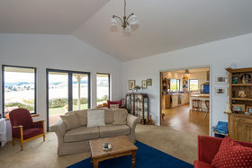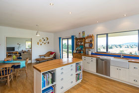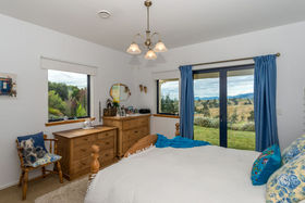 The dining area is open plan to the kitchen, and the lounge room with logburner on wetback can be closed off or kept open to the dining space. The stunning view is always there to enjoy, just through the double glazed windows or French doors off the kitchen, dining, lounge and bedroom areas.