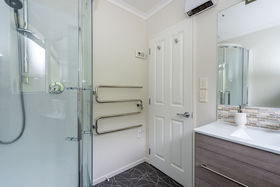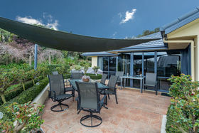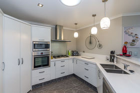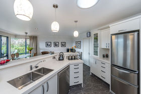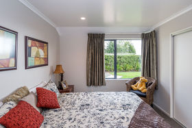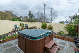 The decor inside the 4 bedroom, 2 bathroom home is stylish and welcoming, with clever use of gorgeous wallpaper, funky vinyl flooring, drapery and light fittings, all presented to an immaculate standard. The kitchen is a chef's delight, with engineered stone benchtops, soft close drawers, double sink, 900mm gas hob and triple pantry space. The dining and lounge areas open through sliders to a paved, north facing courtyard, great for entertaining or that morning coffee, edged with raised box hedging and iceberg roses, providing a private outdoor living space. A line of cherry blossom trees adds further shelter and privacy. Beyond the paved courtyard is a flowing green lawn and full height hedging, which leads you to another separate space that contains the spa pool.
