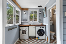 The spacious lounge enjoys large picture windows that capture natural light and peaceful garden views. A custom designed oak kitchen features engineered stone benchtops and an apron-front sink, creating a stylish yet functional hub for daily life. The family bathroom has been fully modernised to suit today's lifestyle, while the original washhouse has been cleverly transformed into a practical mudroom and laundry with a separate toilet - perfect for busy households.
