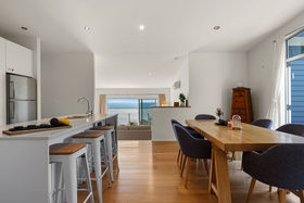 Step inside to a sleek, walk-around kitchen that flows seamlessly to a private outdoor patio - perfect for entertaining or enjoying a morning coffee. The open living area is bathed in light, offering uninterrupted views of the sea, creating a serene and inviting space for relaxing or hosting guests.